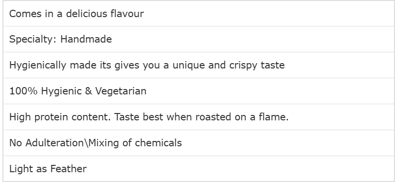 100 % Traditional process made Appalam / Papad / Papadum prepared from selected quality Urad Dhal from specific region of India. No preservative and machinery used.