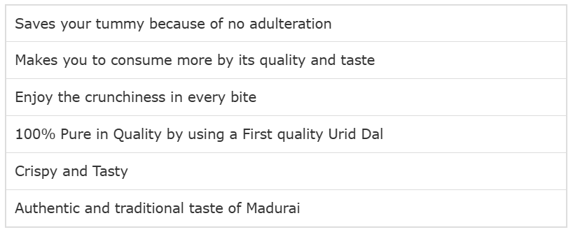 Manufactured by team of food technicians well-trained on appalam making whose primary focus is to ensure the crispiness & tasty in hygienic process. 100% quality tested & certified food product.